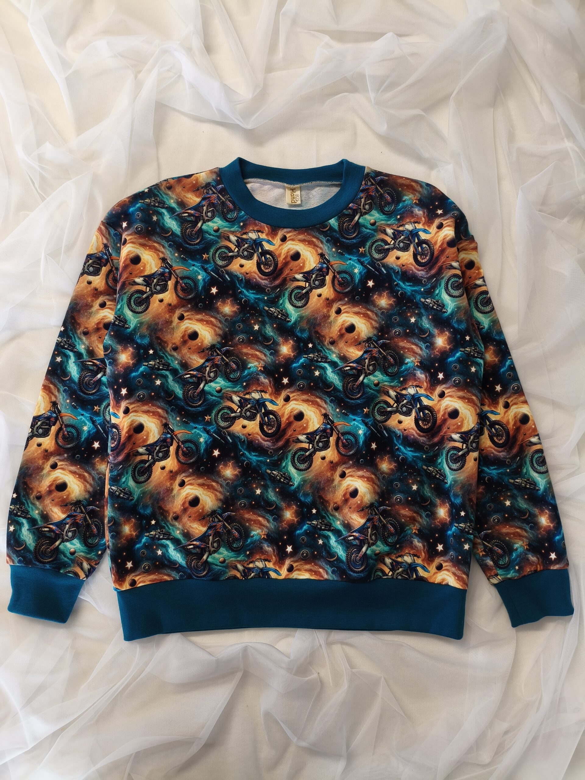 Kokvilnas cilpiņtrikotāžas džemperis ar motociklu rakstu lieliski noderēs ikdienas valkāšanai.