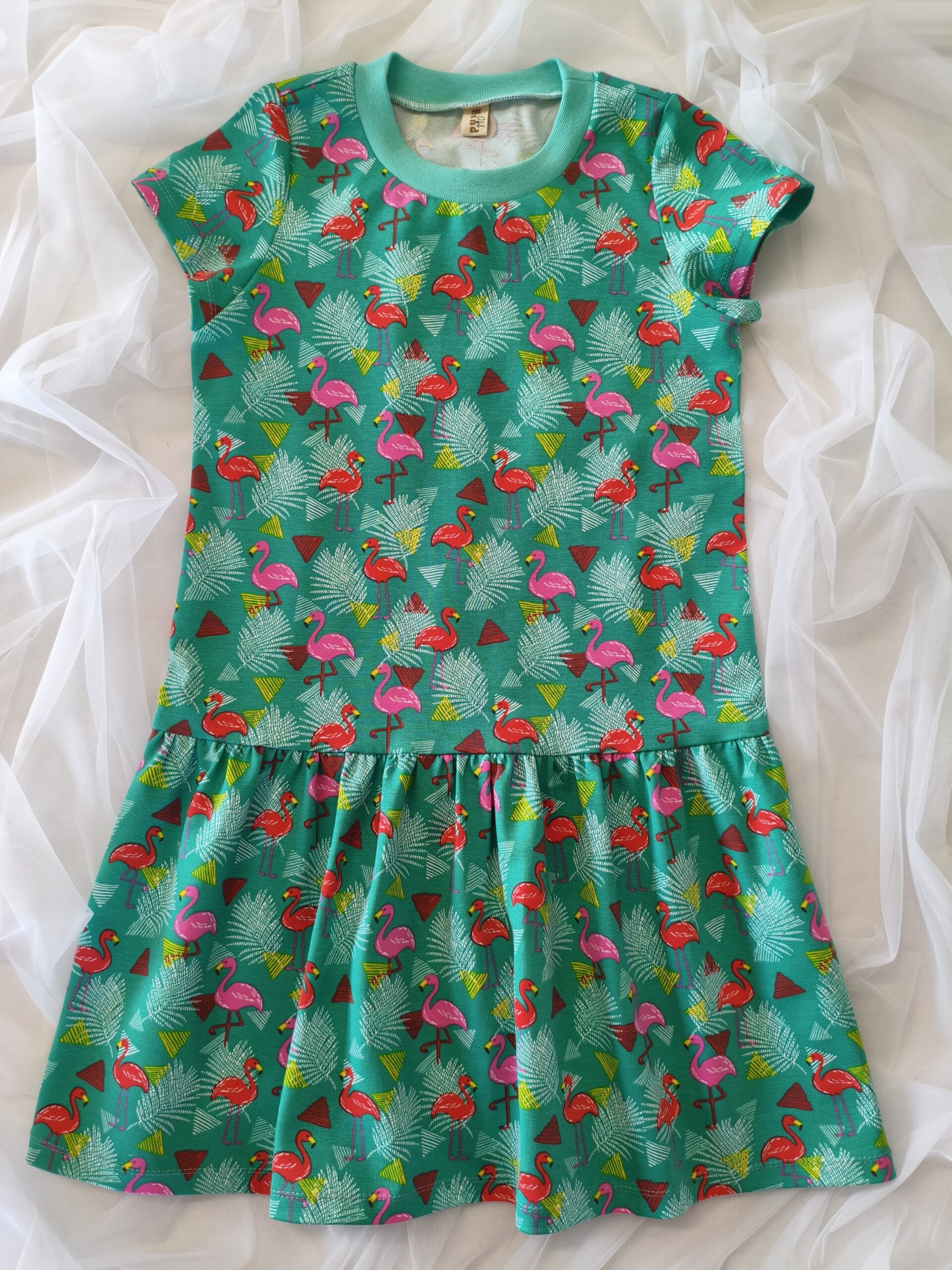 Plānās trikotāžas kleita ar flamingo rakstu lieliski iederēsies jūsu bērna garderobē, piemērota ikdienas valkāšanai.