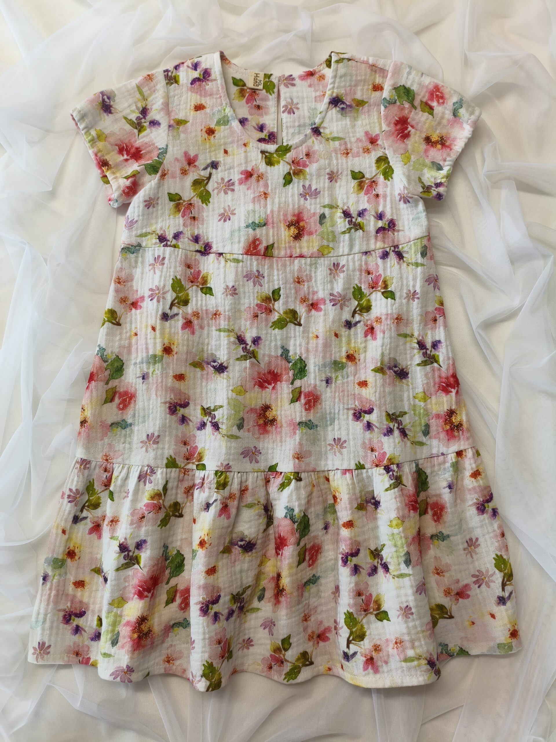 Viegla, mīksta , gaisu caurlaidīga muslīna kleita ar maigo ziedu rakstu būs piemērota gan svētku, gan ikdienas valkāšanai.