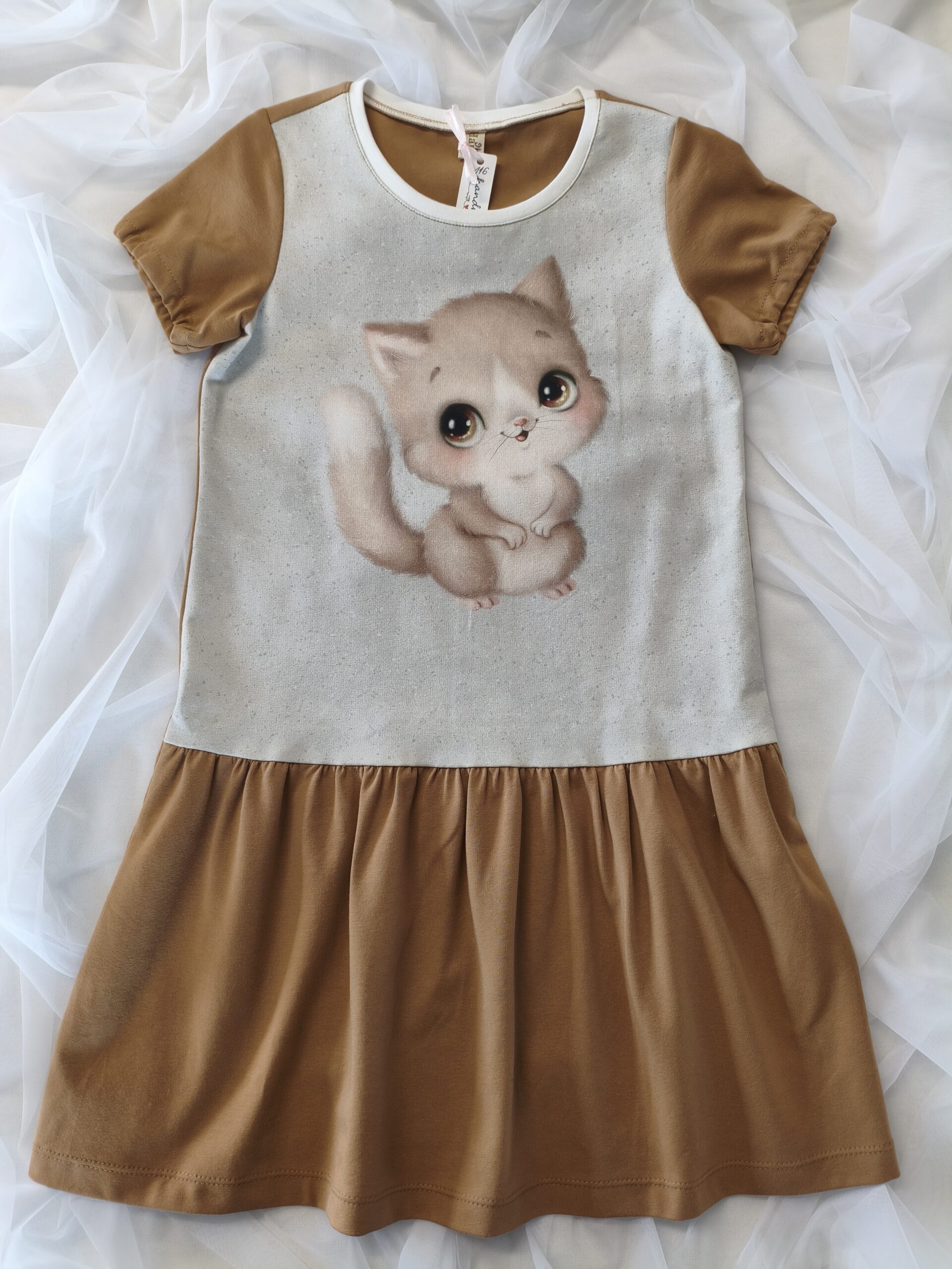 Plānās kokvilnas trikotāžas kleita ar smaidīga kaķa apdruku, ļoti ērta ikdienas valkāšanai.