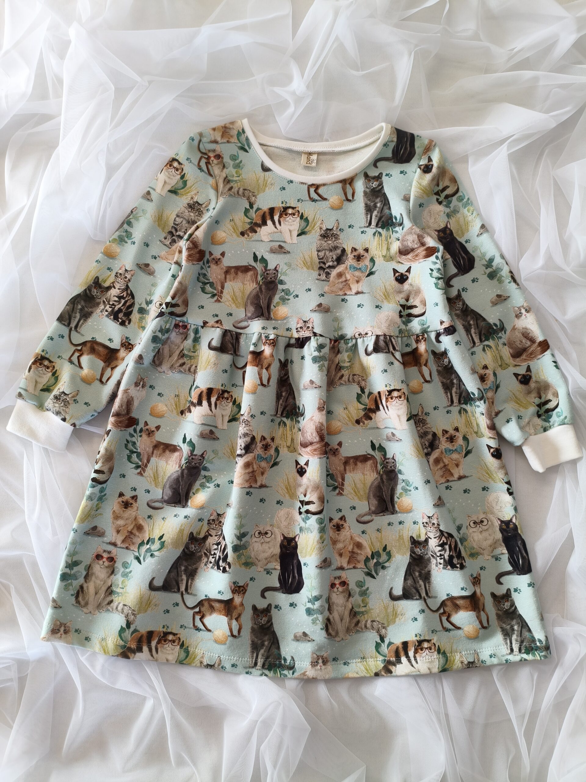 Kokvilnas cilpiņtrikotāžas kleita ar jaukajiem kaķiem , piemērota gan ikdienas valkāšanai, gan svētkiem.