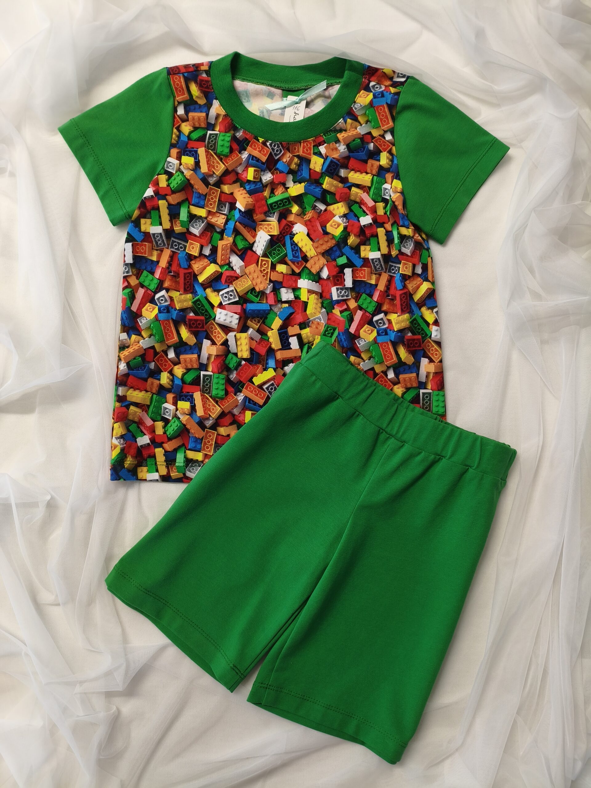 Plānās kokvilnas trikotāžas vasaras kostīms ar košu lego rakstu, piemērots ikdienas valkāšanai.